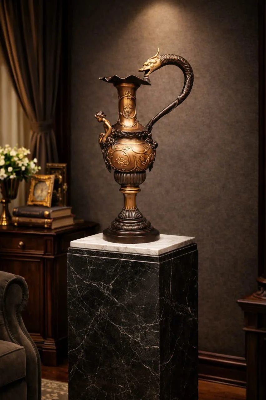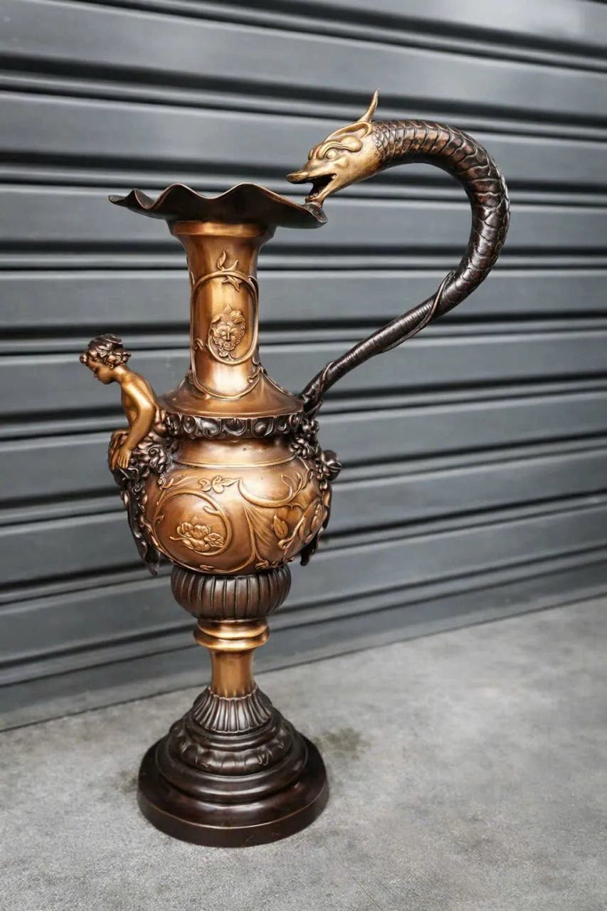 This elegant ornate cast bronze vase is crafted using the traditional lost wax casting method, a technique that allows for fine detail and high-quality bronze work. A timeless decorative piece suitable for both indoor and outdoor spaces.