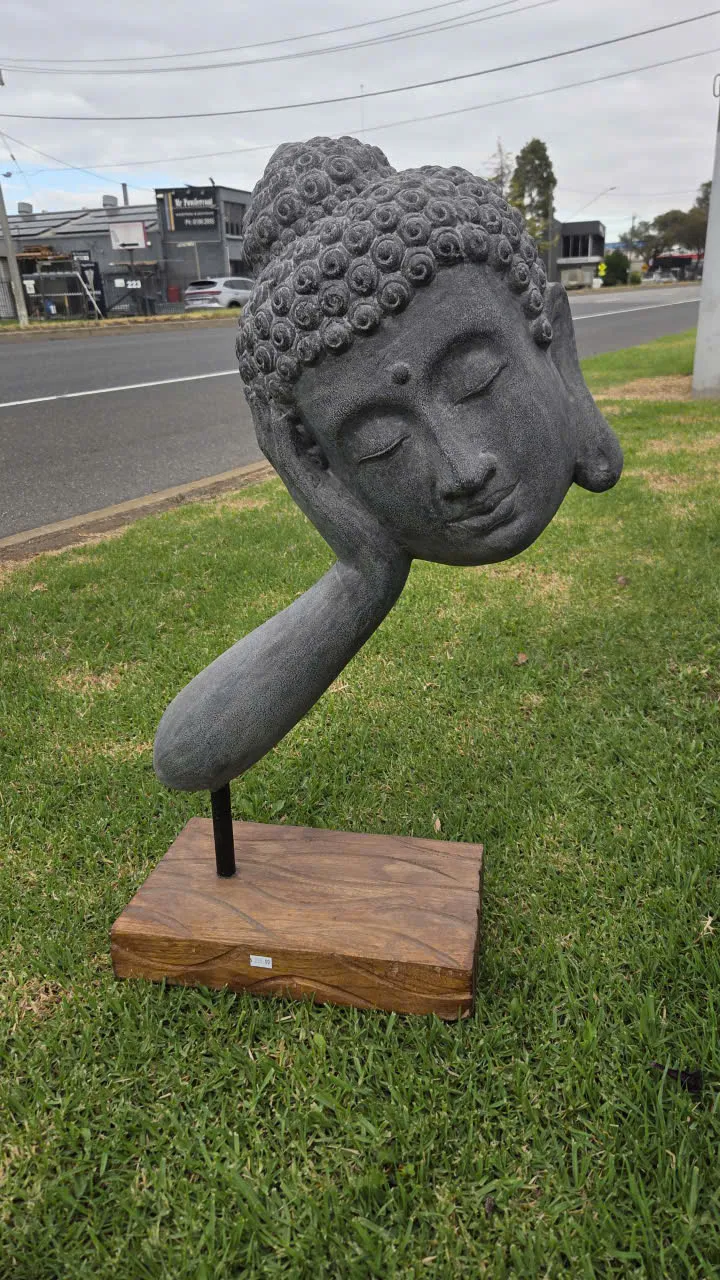 Beautiful Buddha head sculpture resting on a sculpted hand with a solid wooden base. A stunning décor piece that brings peace and style to any home, office, or garden. Perfect for modern and zen-inspired spaces.